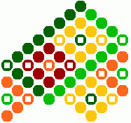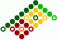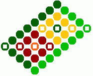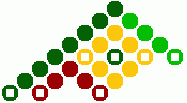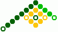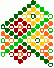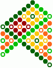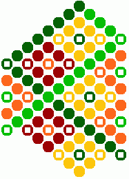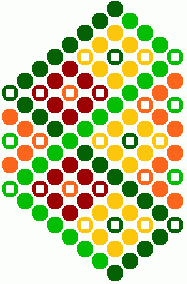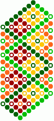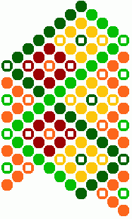 9) Ihneď pod žltou kostičkou urobíme ďalšie postranné oranžové trojuholníčky. Tmavo zelenou bavlnkou urobíme 6 uzlíkov vpravo a jeden spätný vľavo. Svetlo zelenou bavlnkou urobíme 3 uzlíky vľavo a jeden spätný vpravo.
